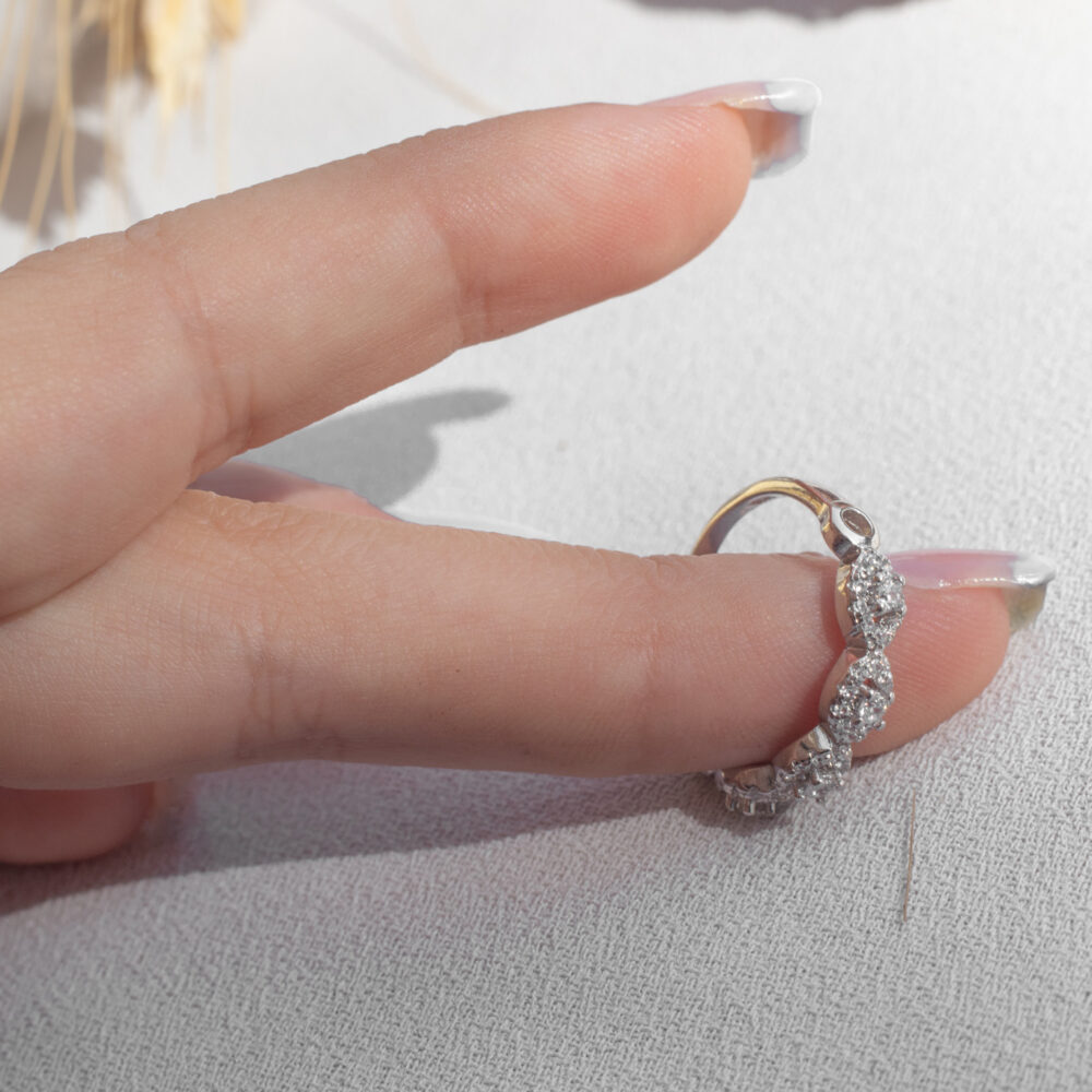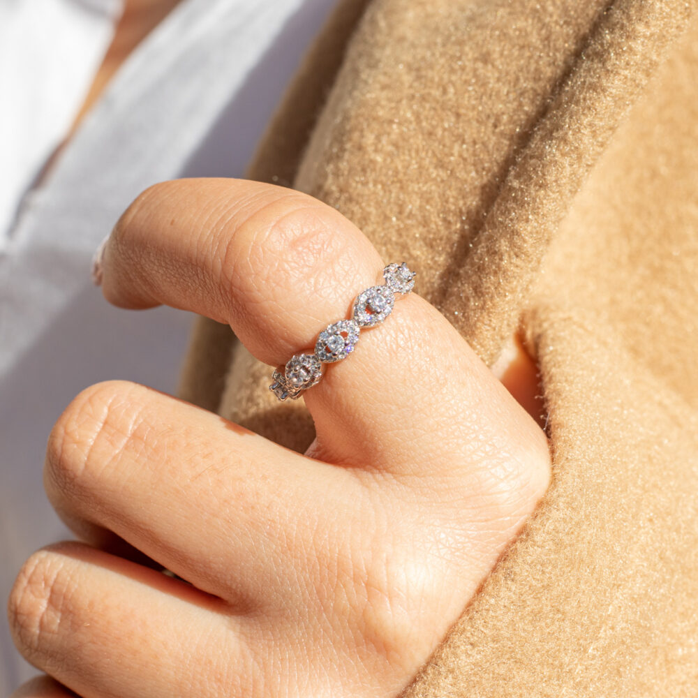 הטבעת מעוצבת , עם חמש שיניים משובצים באבני זרקון.