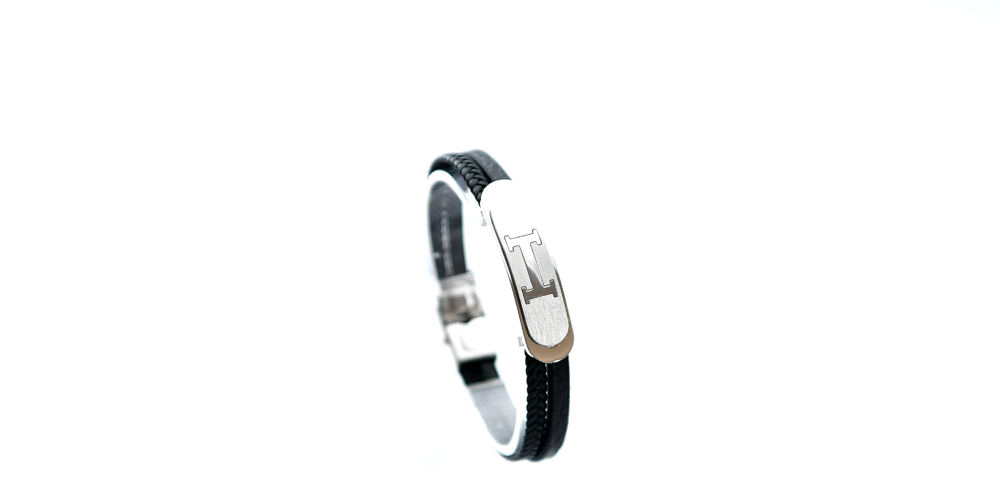 צמיד לגבר מעור שחור בשילוב פלטת אל חלד בציפוי IP