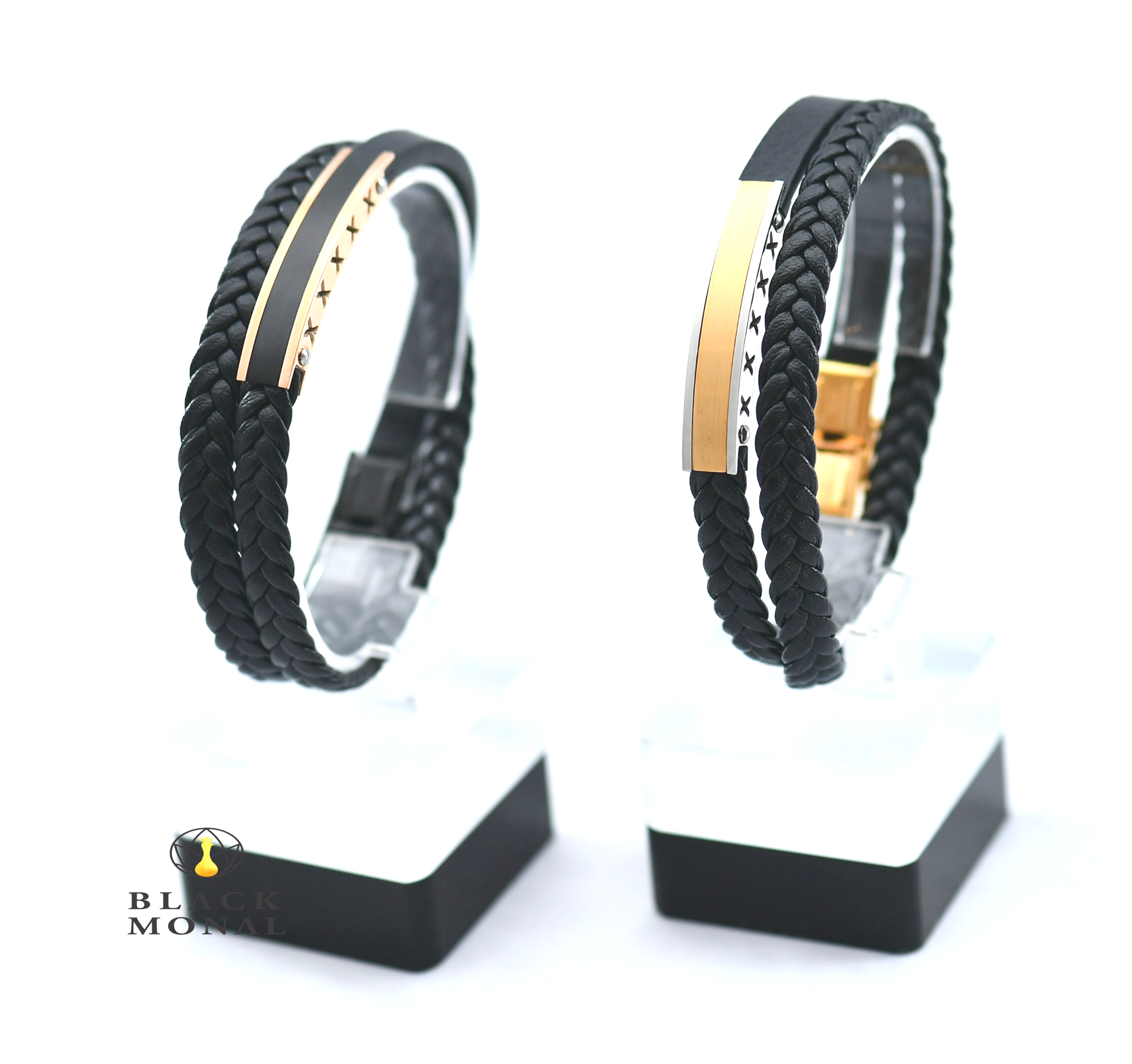 צמיד גבר שתי שורות מעור קלוע בשילוב פלטת סטיל